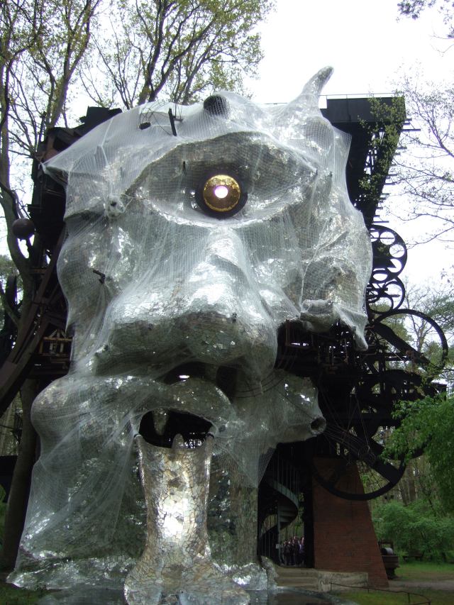 Au premier regard, ce Cyclop égaré dans Ia forêt m’a impressionnée et inquiétée : dominée par la grandeur de l’œuvre, je me sentais écrasée et infime. Etourdie par le bruit fracassant qu’elle produisait, j’étais dérangée, presque agacée. Puis, après m’être habituée à cette hauteur, à ce vacarme, je commençai à apprécier cette structure monumentale. Oui, il est vrai que le bruit était parfois désagréable, mais cela rendait encore plus poétiques les moments où seuls les sons de la forêt pouvaient être entendus. Oui, il est vrai que cette Tête était d’une taille gigantesque mais je finis par être éblouie par l’harmonie du lieu.